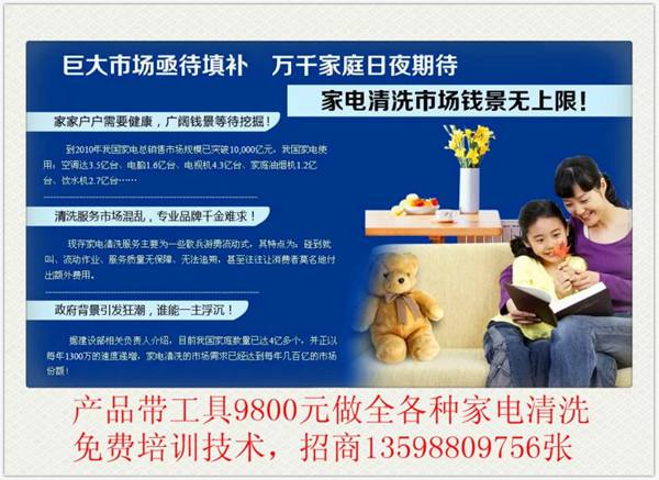 如果你想創(chuàng)業(yè),又找不到投資方向,請聯(lián)系我們。如果你在做家電制冷維修,那么家電清洗無疑使你多了一項增值項目。如果你做著家政保潔,那么在不增加人力的情況下加一項清洗項目,多一份收益,何樂而不為呢。如果你是在銷售家用電器,還要為售后服務(wù)不完善發(fā)愁嗎,家電清洗服務(wù)是不錯的選擇。