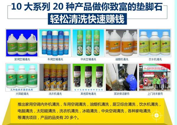 洗多多家電清洗招商加盟中心推出的有家用空調(diào)內(nèi)外機(jī)清洗,車用空調(diào)清洗,油煙機(jī)清洗,飲水機(jī)清洗,電腦清洗,太陽能清洗,洗衣機(jī)清洗,冰箱清洗,中央空調(diào)清洗,各種家電清洗等清洗項目20多個。這些品類都是投資少,賺錢快,低風(fēng)險高收益的特別適合創(chuàng)業(yè)的好項目。、家電清洗加盟廠家,家電清洗設(shè)備生產(chǎn)廠家,家電清洗劑,家電清洗設(shè)備